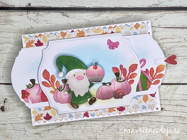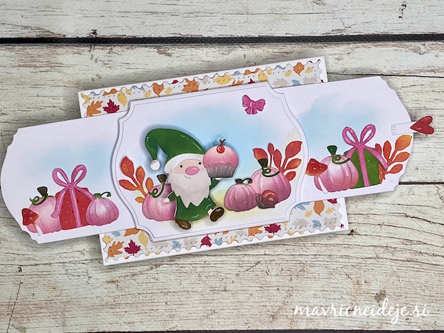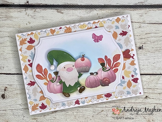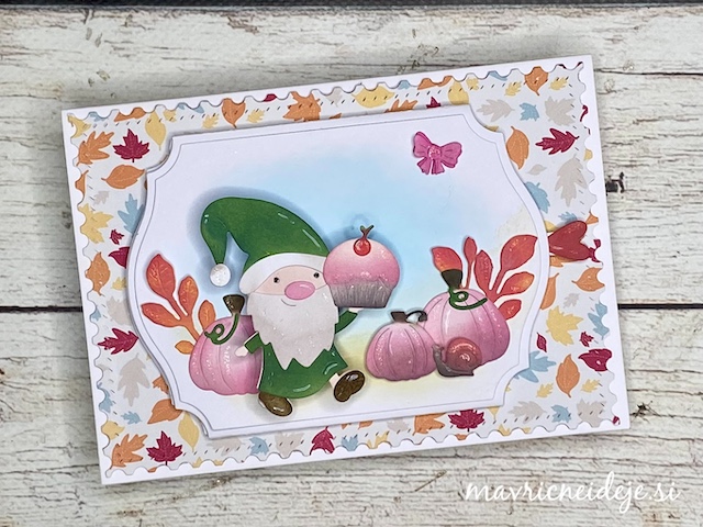 Vse elemente sem izrezala iz belega papirja. Škratca in bučke sem pobarvala z Distress oxide inki in dodala malo bleščic z Wink of stella markerjem.