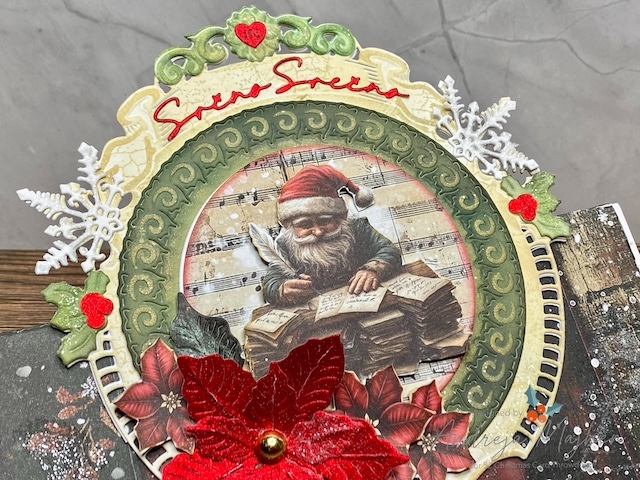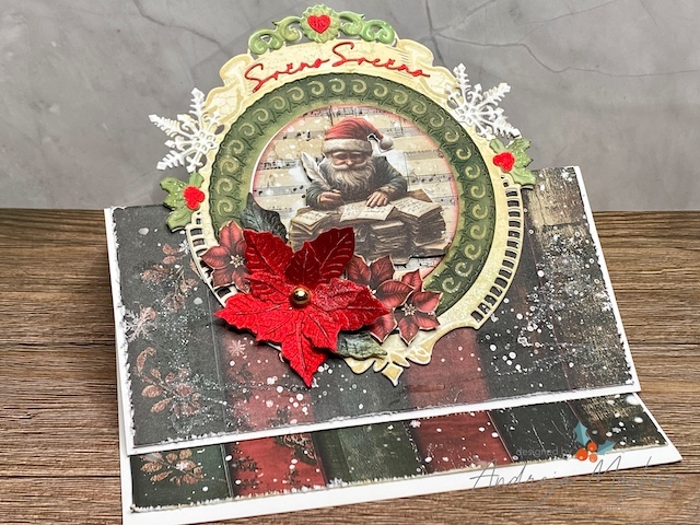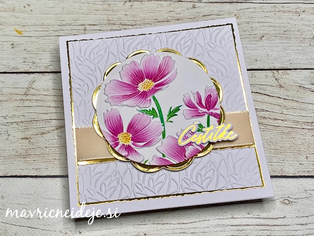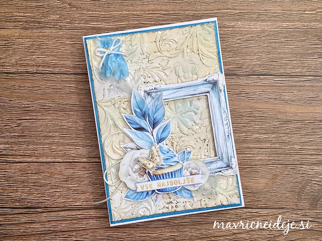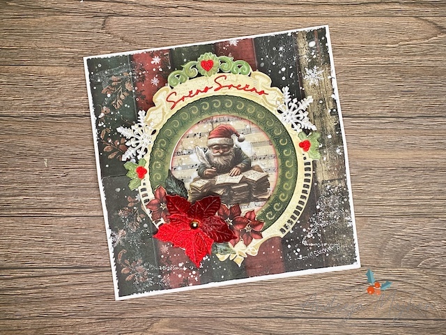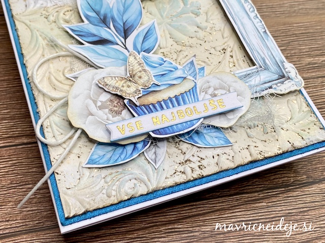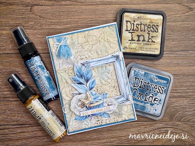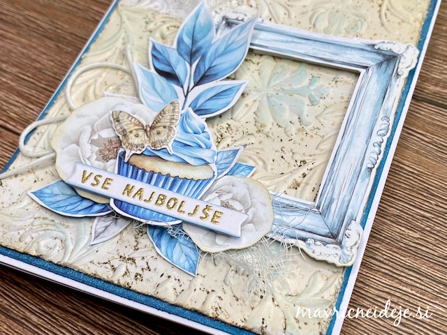Osnovo za voščilnico sem izdelala iz belega 300g papirja in meri 7″ x 7″. Iz potiskanega papirja sem izdelala ozadje in glavni motiv. Dekorativne plasti sem izrezala iz belega papirja in ga pobarvala z Distress ink blazinicami.