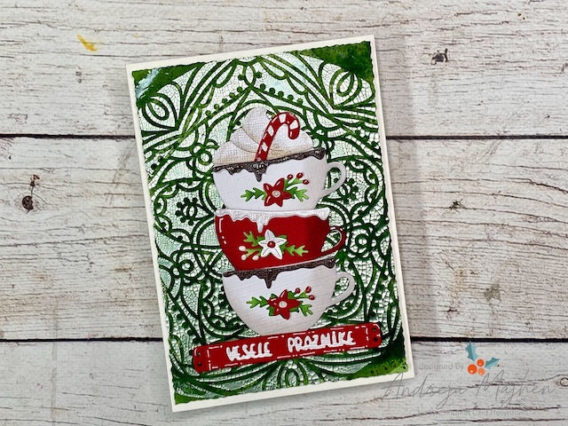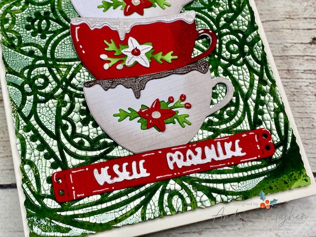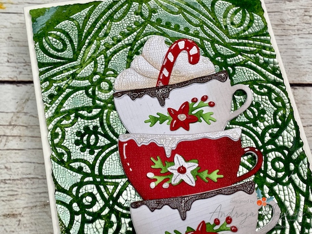 V zalogi ozadij sem našla bogat zeleno pobarvan papir, na katerega sem preko stencil šablone nanesla perl teksturno pasto, ki pru sušenju razpoka. Izreze sem si pripravila iz barvnega papirja s teksturo in jih osenčila z Distress blazinicami.