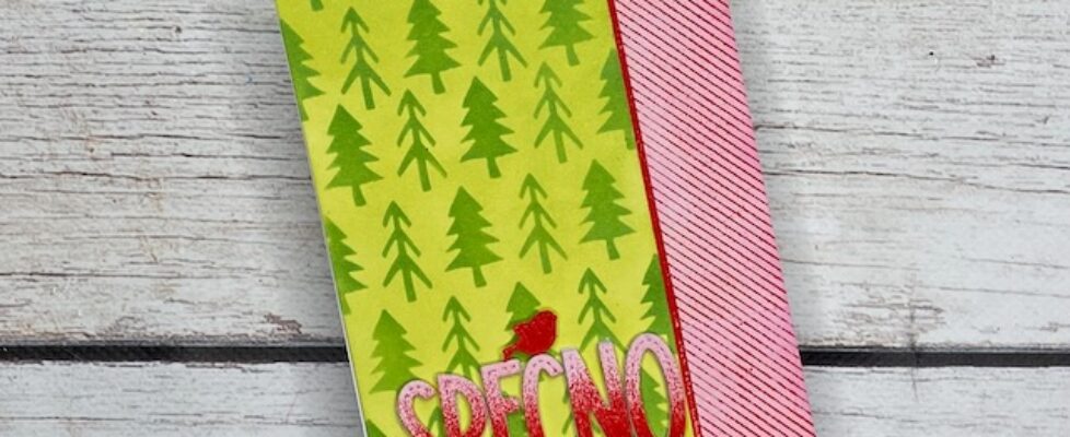 Bel papir sem obarvala z Distress oxide rumeno zeleno blazinico in preko stencil šablone dodala smrečice.