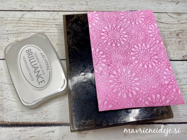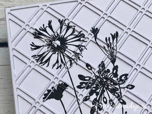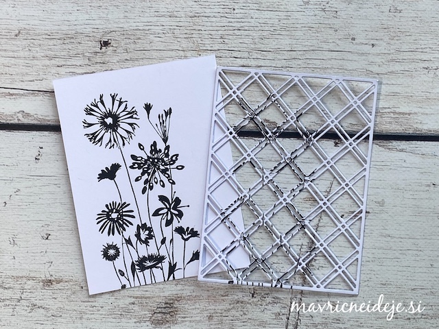 Izbrala sem zelo staro štampiljko z motivom travniškega cvetja in s črno blazinico naredila odtis na dva papirja enakih velikosti. Prvi odtis sem namestila na osnovo za voščilnico iz drugega pa sem izrezala motiv mreže.