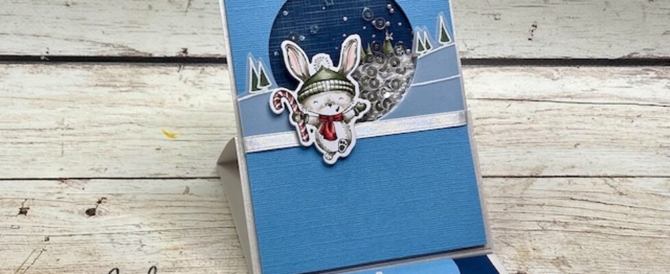 Sprednja stran je tresočka z okroglim izrezom. Zimska pokrajina je v tresočki in okoli izreza. Zunanji del pokrajine sem odtisnila in embosirala na pavs papir in z zadnje strani pobarvala z alkoholnimi markerji. Pavs papir sem zaključila z belim trakom.