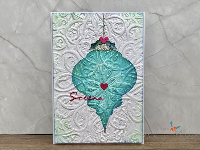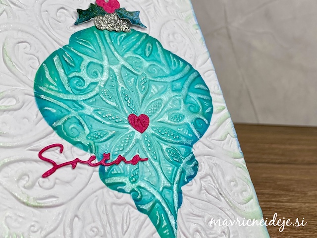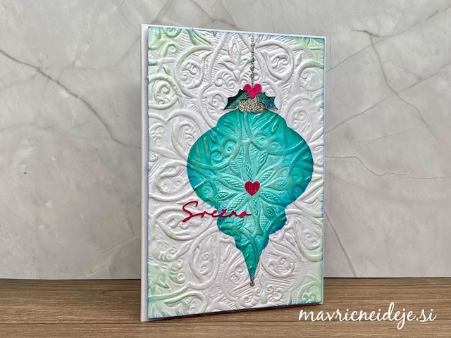 Bel papir sem embosirala v teksturni srajčki in iz prosojne folije izrezala motiv novoletnega okraska. Izrez sem nato uporabila za senčenje z Distress inki.