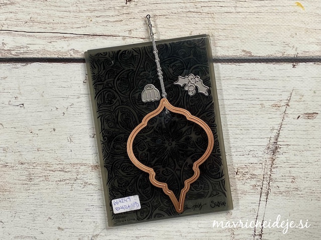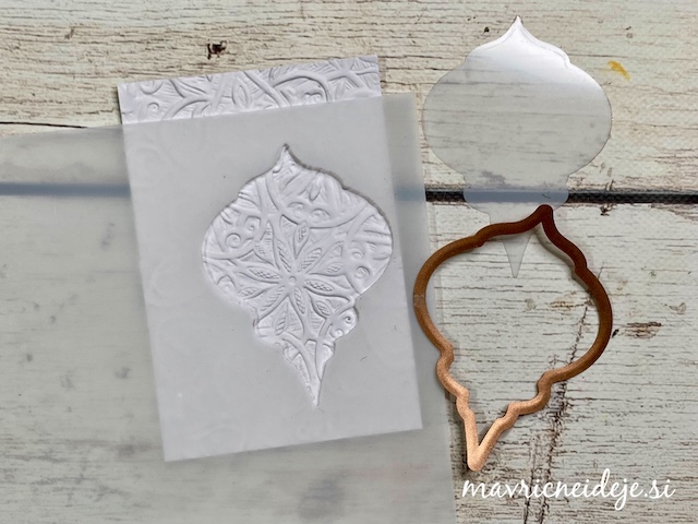 Bel papir sem embosirala v teksturni srajčki in iz prosojne folije izrezala motiv novoletnega okraska. Izrez sem nato uporabila za senčenje z Distress inki.