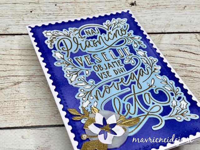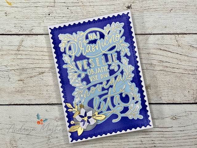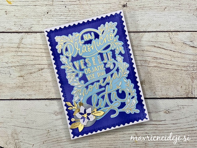 Vse izreze sem si pripravila iz belega papirja. Napis sem vroče embosirala z zlatim prahcom in nato ozadje pobarvala z modrimi Distress Oxide blazinicami.