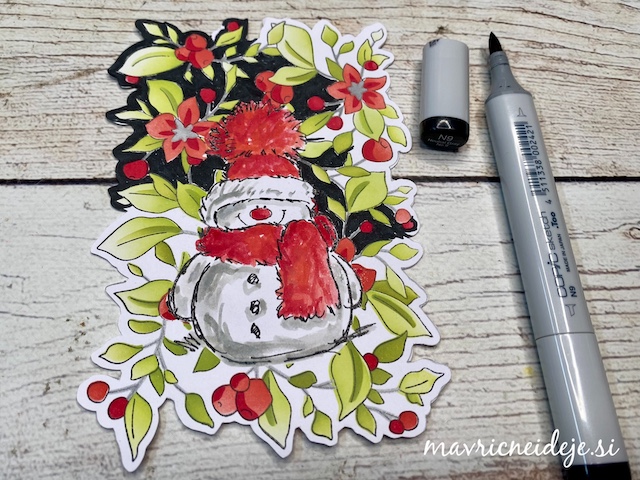Snežkota sem odtisnila na bel papir, ga zamaskirala in preko odtisnila večjo cvetlično štampiljko. Cvetje sem pobarvala preko stencil šablone, snežkota s čopičem in nato še ozadje s črnim markerjem.