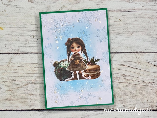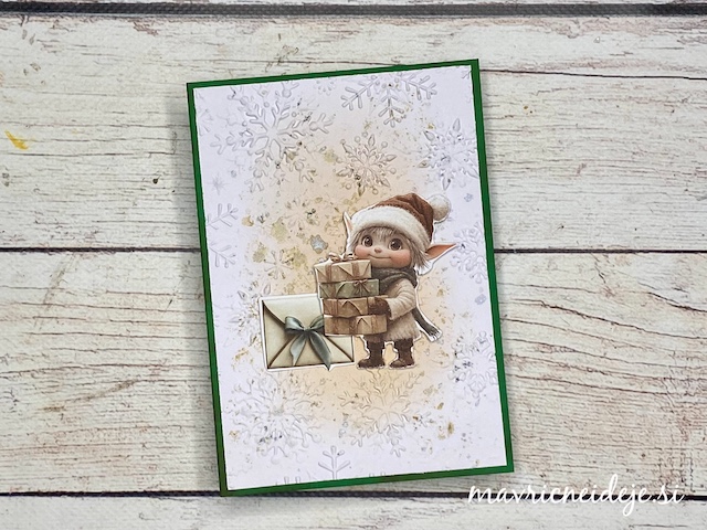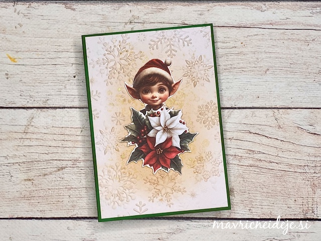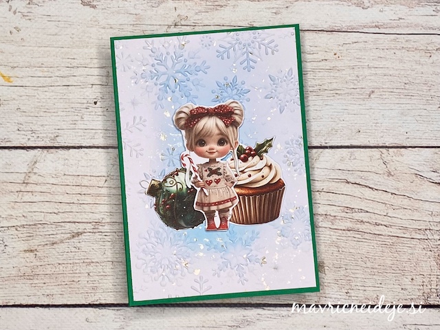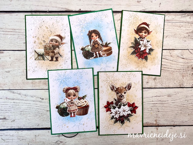 Vse voščilnice so izdelane po enakem postopku. Za ozadje sem v teksturni srajčki embosirala bel papir, ki sem ga nežno obarvala z Distree blazinicami. Dodala sem bleščeče kapljice Distress spritz sprej. Motive sem na ozadje namestila s tekočim lepilom in 3d lepilnim trakom.