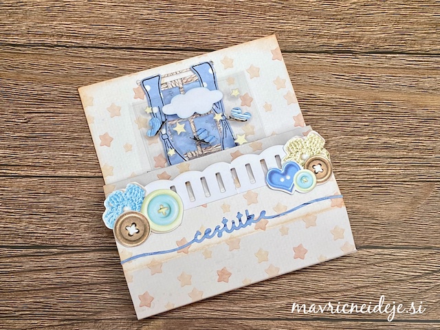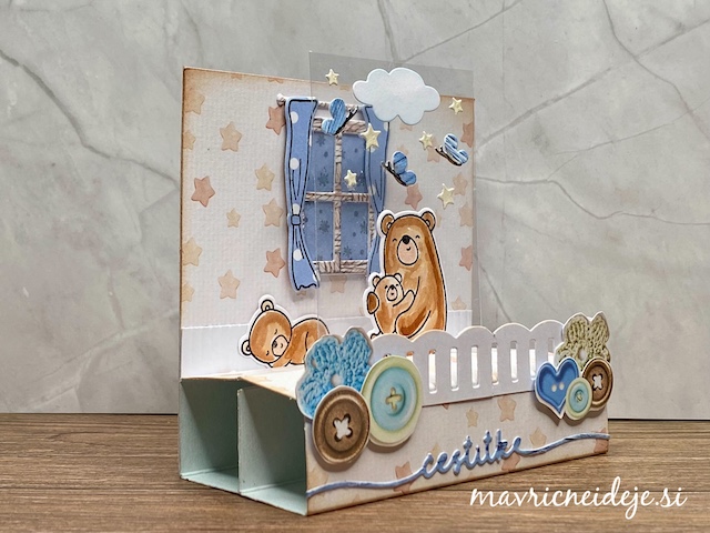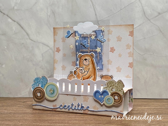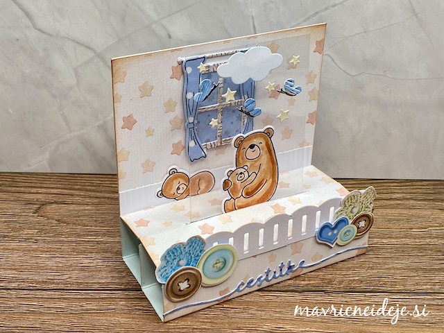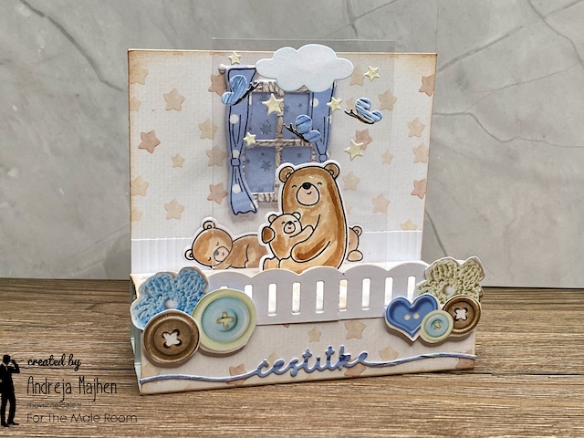 Pozdravljeni v novem The Male Room Blog izzivu. Ta mesec so tema voščilnice za novorojenčka – fantka. Izdelala sem 3d voščilnico z medvedki.