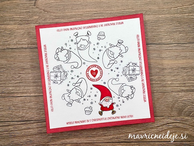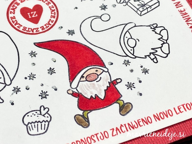 Sedma naloga V Mala šola prazničnega ustvarjanja – 13. sezona se glasi: NAJ BO NA VOŠČILNICI POBARVAN IN NEPOBARVAN DEL ENAKEGA ODTISA. Izdelala sem voščilnico z venčkom palčkov in le enaga pobarvala. Dodala sem rdeče napise in bleščice na snežinke.