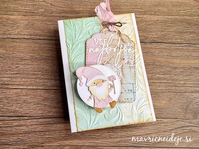 Za ozadje in izreze sem uporabila potiskan papir v nežnih barvah. Robove palčka sem oosenčila z rjavo barvo. Ozadje sem embosirala v teksturni srajčki in za malce sijaja dodala belo perl vosek. Palčka sem namestila na krogec in tega na vobler, da se lepo potresa.