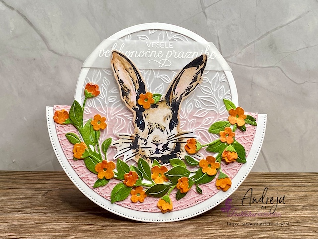 Pavs papir sem embosirala v teksturni srajčki z motivom zelenja in na obe strani nalimama bel obroč. Napis sem na pavs papir vroče embosirala z belim prahcem. Vejice in cvetke sem izrezala iz papirjev, ki sem jih na zalogo pobarvala z Distress spreji.