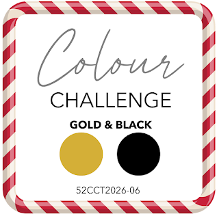 Pozdravljeni v sobotno jutro in novem izzivu pri 52 CCT . Tokrat je na vrsti barvni izziv: samo črna in zlata barva za praznično voščilnico. Kadar črnemu papirju dodamo sijaj ali teksturo mu takoj dodamo eleganco in svetlobo. V kombinaciji z zlatimi motivi pa je zagotovo prava atrakcija.
