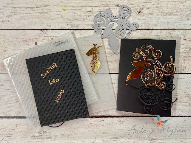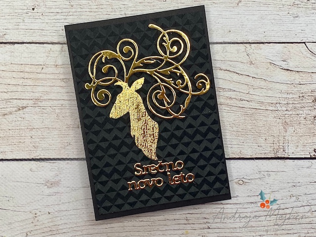 Izreze sem si pripravila iz zlatega mirror papirja, glavi jelena sem dodala teksturo z embosing srajčko, rogovje pa sem pustila v gladki zlati barvi.