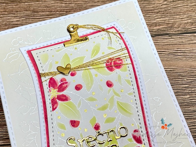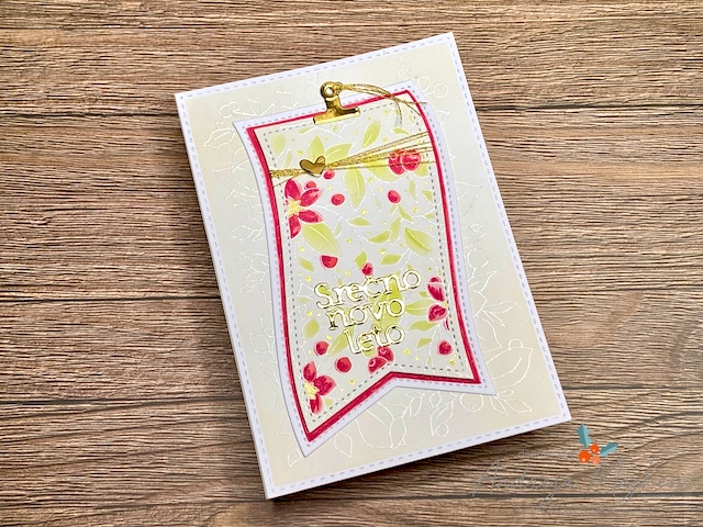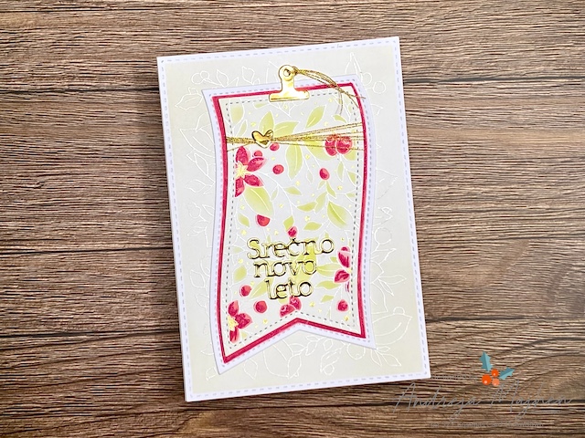 Na bel papir sem odtisnila in z belim prahom embosirala motiv cvetlične čipke. Vso površino sem nežno osenčila s krem barvno blazinico. S šablono zastavice sem izrezala del motiva in ga pobarvala s pomočjo plastičnih šablon.