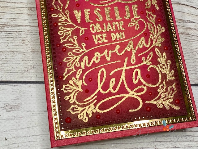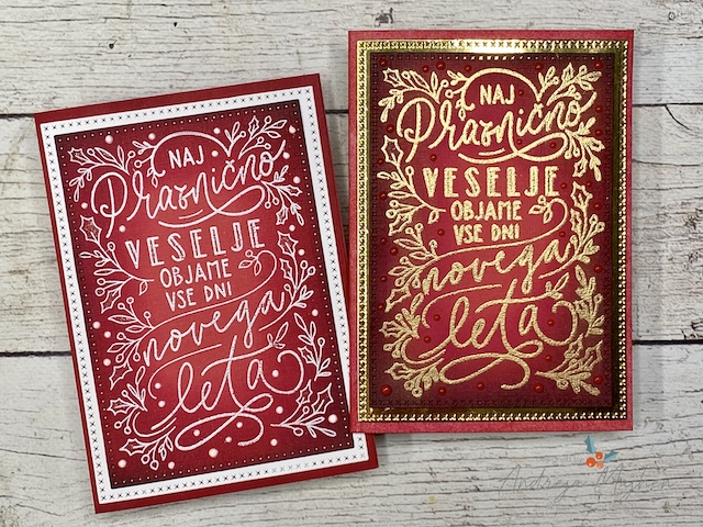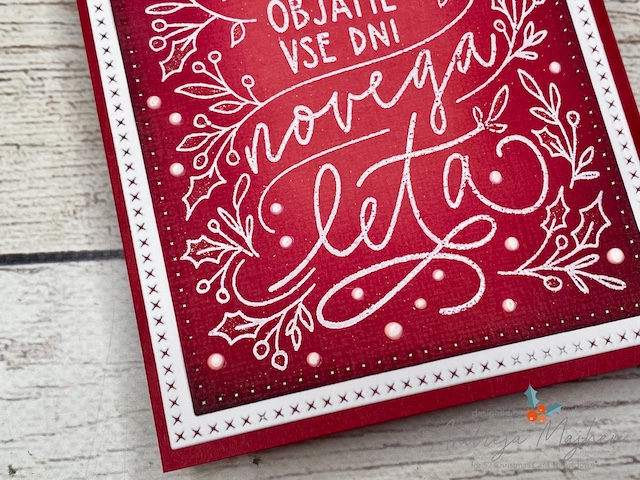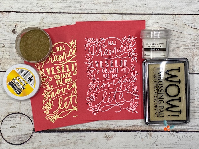 Motiv sem odtisnila na svetlo rdeč papir in ga embosirala z belim in zlatim embosing prahcem. Nato sem robove na široko osenčila s temno rdečo blazinico, bolj ozko pa še s črno. Po končanem barvanju sem s suho krpico obrisala površino embosiranega motiva, da se je ponovno pokazal v svoji pravi barvi.
