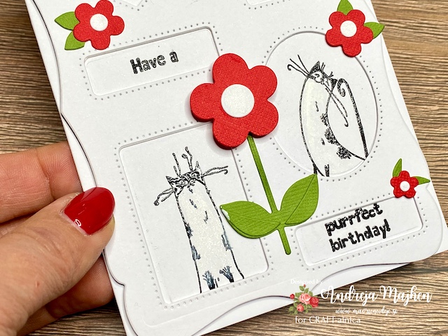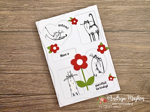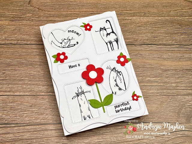 Pozdravljeni v prvem izzivu pri CRAFT-alnici. Tokrat je Urška izbrala izziv ki se glasi: HUDOMUŠNA VOŠČILNICA – Izdelaj voščilnico s zabavnim motivom. Na moji voščilnici so mačke, ki se pretegujejo v sila različnih pozah. Na sredini pa je vrteča rožica.
