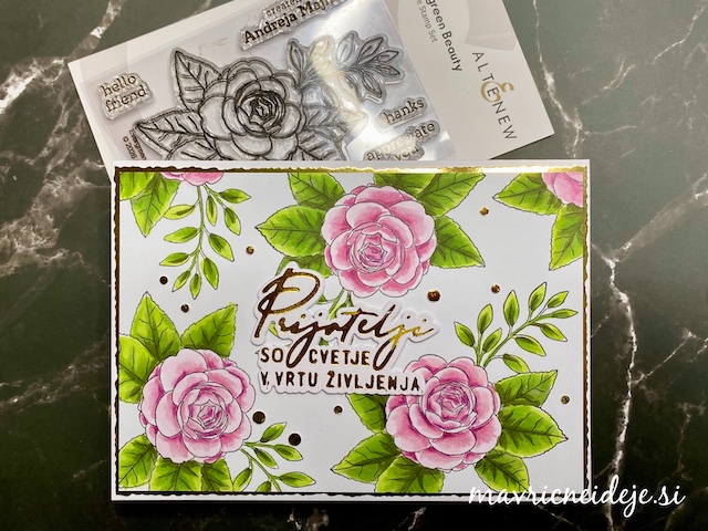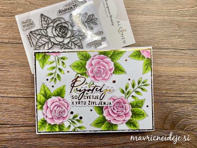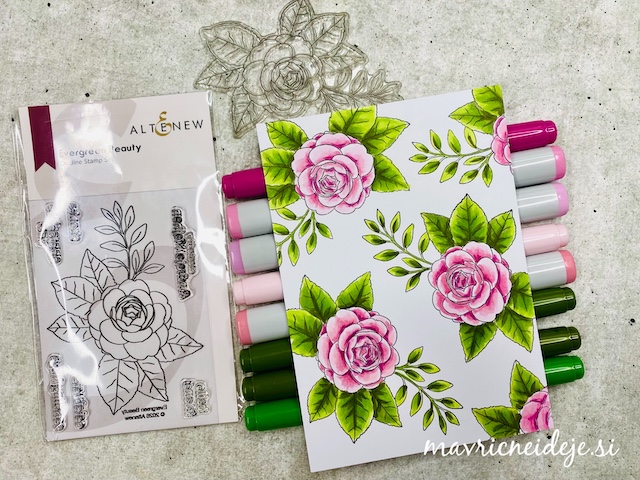 Tokrat sem ustvarila elegantno cvetlično voščilnico, kjer sem v ospredje postavila čudovit cvetlični motiv iz seta Altenew Evergreen Beauty Outline Stamp Set. Motiv sem odtisnila na gladek bel papir in ga pobarvala z alkoholnimi markerji Copic.