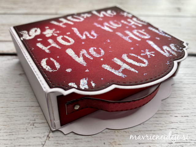 Nato je sledilo izrezovanje in barvanje “lesenih” kolutov, drugega ozadja in zelenja z božično zvezdo. Vse sem izrezala iz krem, 300g papirja in barvala z Distress inki.