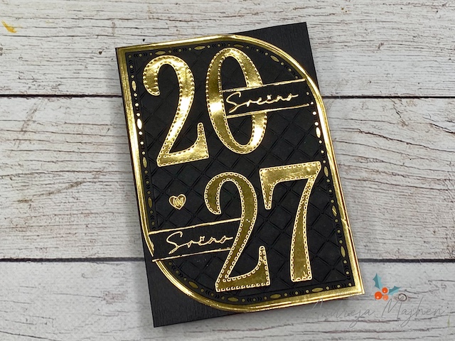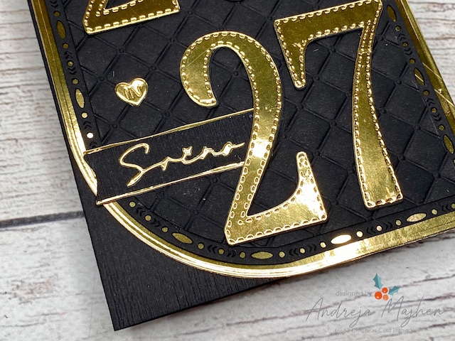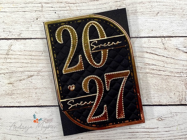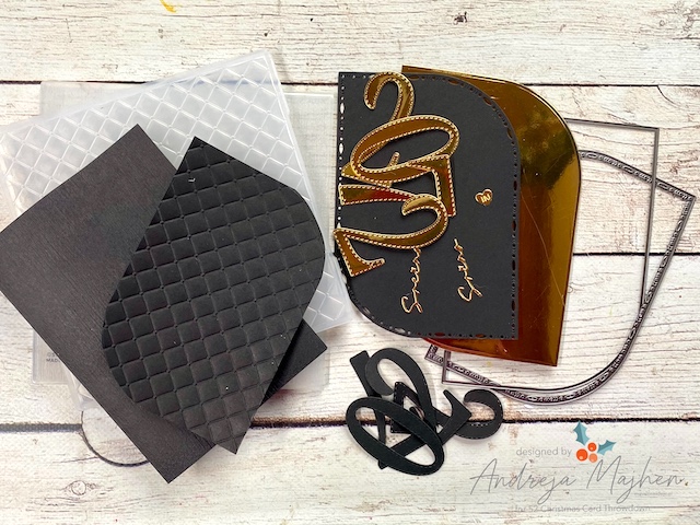 Izreze sem si pripravila iz črnega in zlatega papirja ter osnovo in še en izrez za ozadje embosirala v teksturni stajčki.